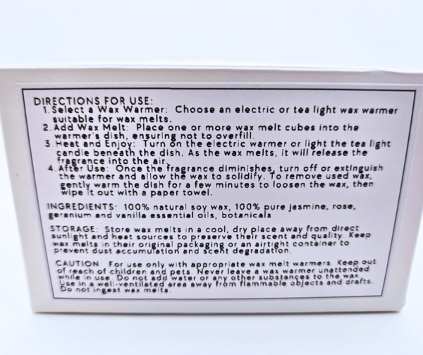 CAUTION: For use only with appropriate wax melt warmers. Keep out of reach of children and pets. Never leave a wax warmer unattended while in use. Do not add water or any other substances to the wax. Use in a well-ventilated area away from flammable objects and drafts. Do not ingest wax melts.
