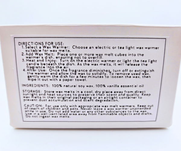 CAUTION: For use with approved wax melt warmers only. Keep out of reach of children and pets. Never leave a wax warmer unattended while in use. Do not add water, oils, or other substances to the wax. Use in a well-ventilated area, away from flammable objects and drafts. Do not ingest wax melts.