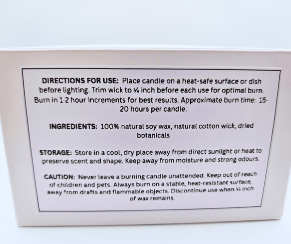 CAUTIONS: For decorative use only. Botanicals embedded in wax are flammable - burn with care. Do not burn candle all the way down to the base. Discontinue use when ½ inch of wax remains.